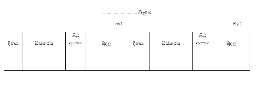 සාම්ප්රදායික ලෙජර් ගිණුමක ආකෘතිය T හැඩයක් ගන්නා අතර භාවිතයේදී පහත ආකෘතිය භාවිතා කරයි.